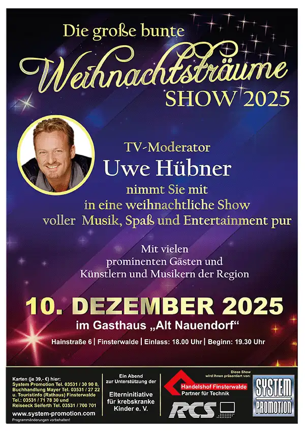 Wir sind sehr dankbar, dass wir mit TV-Moderator Uwe Hübner, einem mit uns in inzwischen ebenfalls sehr herzverbundenen Menschen, unsere 15. Weihnachtsträume Show